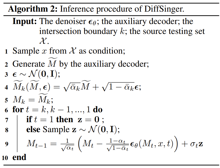 - $\tilde{M}$은 악보 encoder output에 따라 조건을 가진 L1 loss로 학습됨 - Diffusion process를 통해 shallow step $k$에서 intermediate sample을 생성