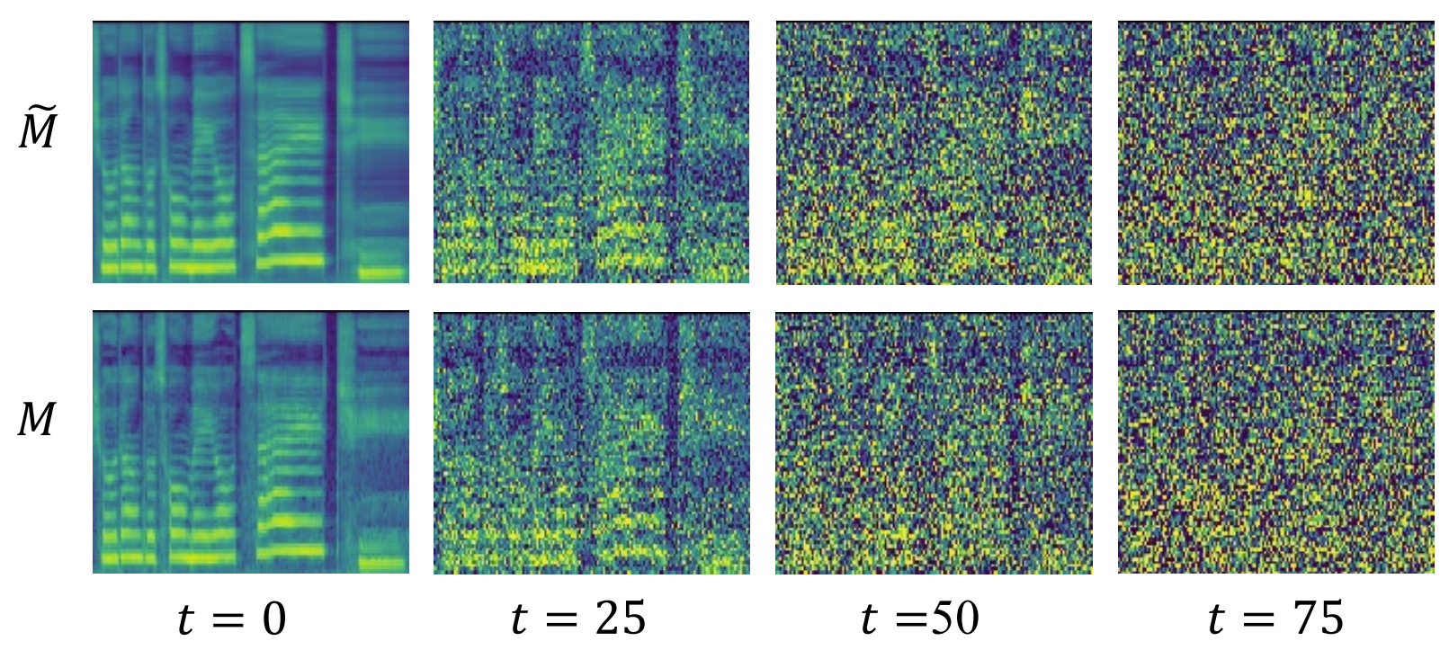 - $\tilde{M}$ : L1 loss로 학습된 decoder의 mel-spectorgram - $t$가 증가함에 따라 두 process의 sample은 구별 불가능함