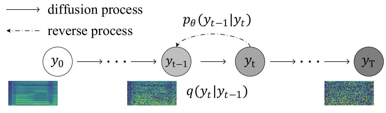 - 각 diffusion step $t \in [1, T]$에서, tiny Gaussian noise가 variance schedule $\beta = \{\beta_{1}, ..., \beta_{T} \}$에 따라 $y_{t}$를 얻기 위해 $y_{t-1}$에 더해짐