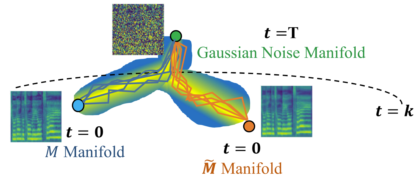 - Diffusion step이 충분히 클 때, $\tilde{M}$ manifold에서 Gaussian noise까지의 trajectory와 $M$에서 Gaussian noise manifold까지의 trajectory는 intersect 함