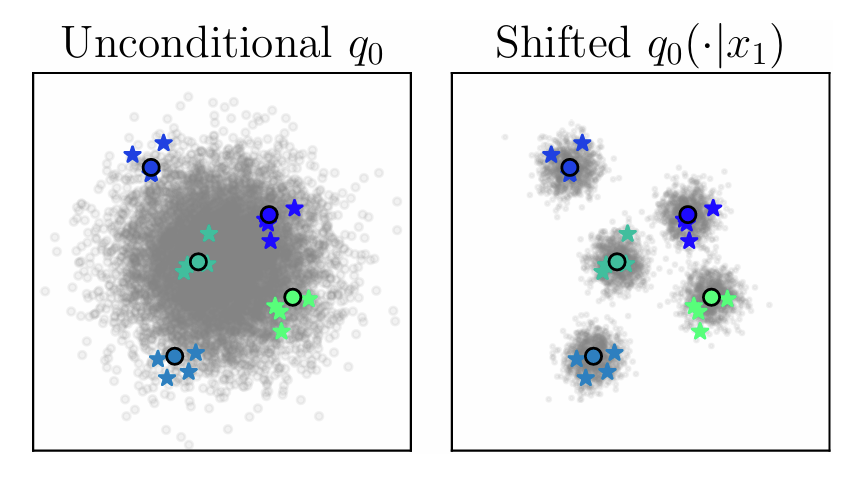 - Original flow matching formulation에서 $x_{0},x_{1}$은 zero-mean Gaussian $q_{0}=\mathcal{N}(0,\sigma^{2}I)$에서 independently sampling 됨