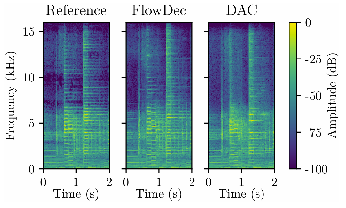 - Spectrogram 측면에서도 FlowDec은 더 나은 reconstruction이 가능함