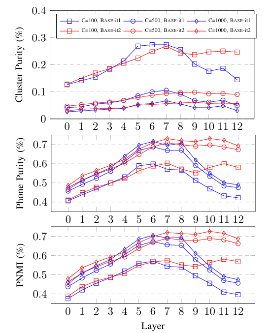 - MFCC는 $K=100$에서 각각 $(0.099,0.335,0.225)$의 cluster purity, phone purity, PNMI를 달성하고 $K=500$의 경우 각각 $(0.031, 0.356, 0.287)$을 달성함
