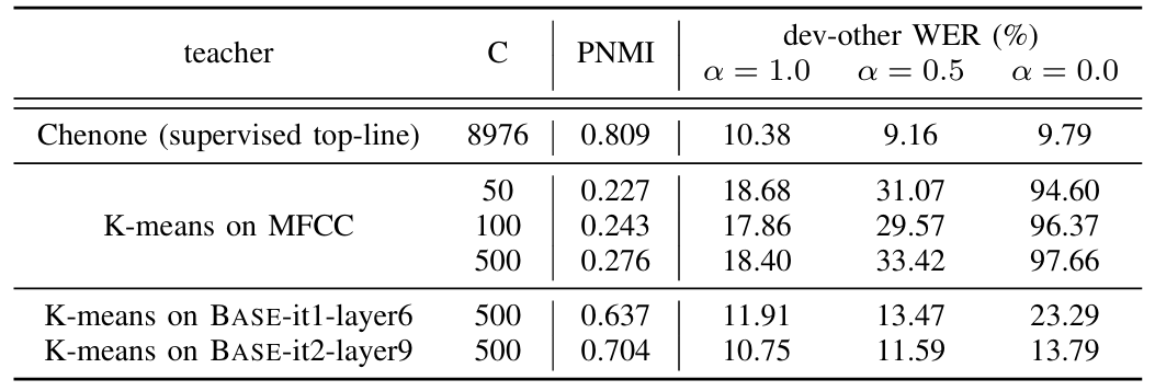 - 대표적으로 서로 다른 codebook size를 가지는 $k$-means model ensemble은 manner class (vowel/consonant)에서 sub-phone state (senones)까지 다양한 granularity의 target을 생성함