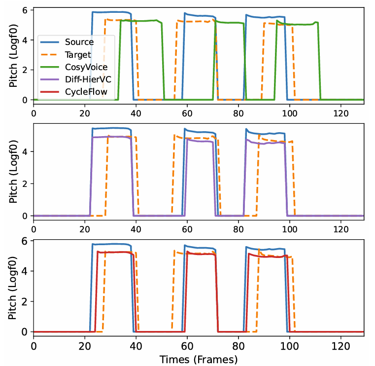 - CycleFlow는 average pitch 측면에서 target speech와 close 함