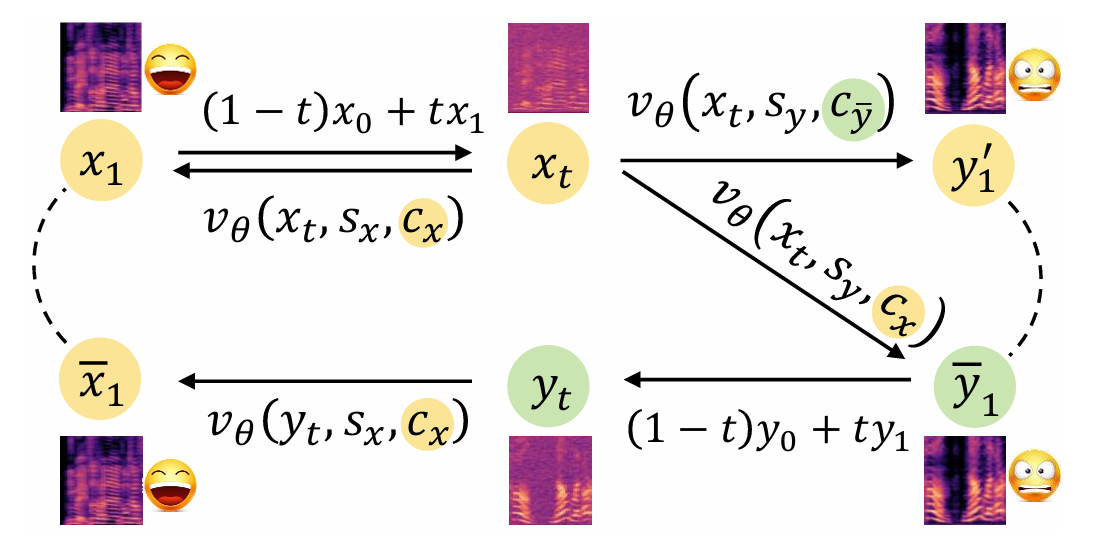 - 즉, $c_{x},s_{y}$를 condition으로 하는 $x_{t}$에서 $\bar{y}_{1}$로의 forward conversion이 주어졌을 때, $\bar{y}_{1}$의 speaker style $s_{y}$, content $c_{y}$에 대한 conditioned conversion을 repeating 하면 $\bar{y}_{1}$을 reproduce 할 수 있음