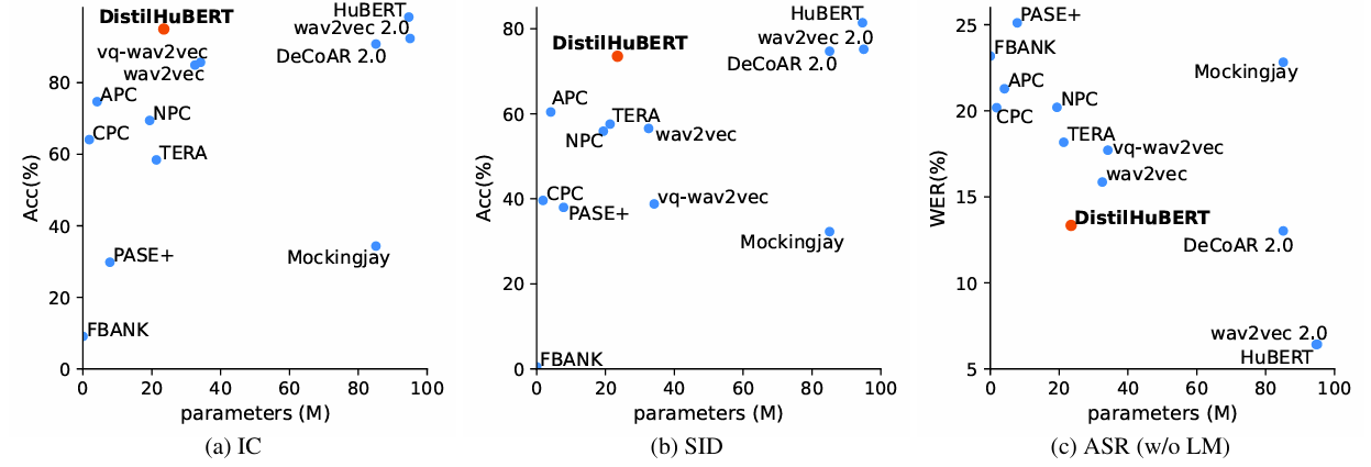 - DistilHuBERT는 model size, performance 측면에서 더 나은 trade-off를 가짐