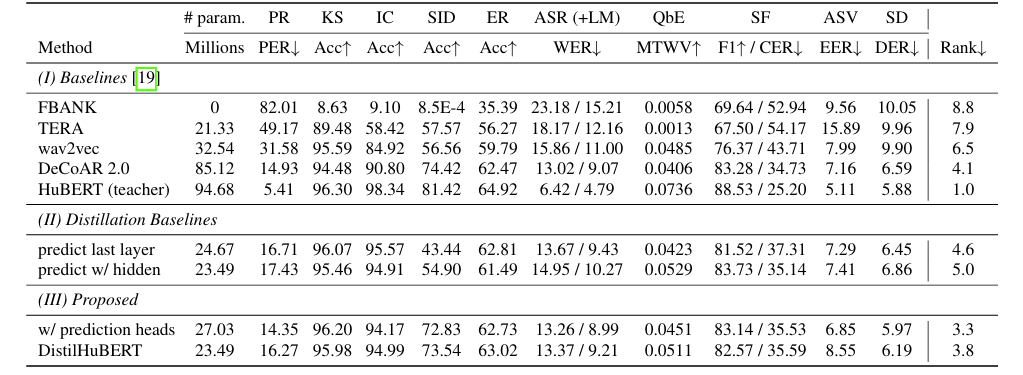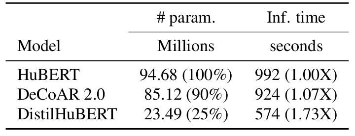 - DistilHuBERT는 HuBERT에 비해 75% 더 작은 size를 가지고, inference speed는 73% 더 빠름