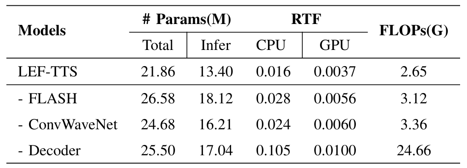 - LEF-TTS는 EfficientTTS2에 비해 33.84%의 training parameter 절감과 89.74%의 FLOPS 절감 효과를 보임