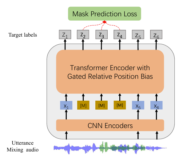 - 결과적으로 HuBERT와 같이 masked region에서 original speech의 pseudo-label을 predict 함 - 추가적으로 Transformer structure에 Gated Relative Position Bias를 추가하여 model 성능을 개선