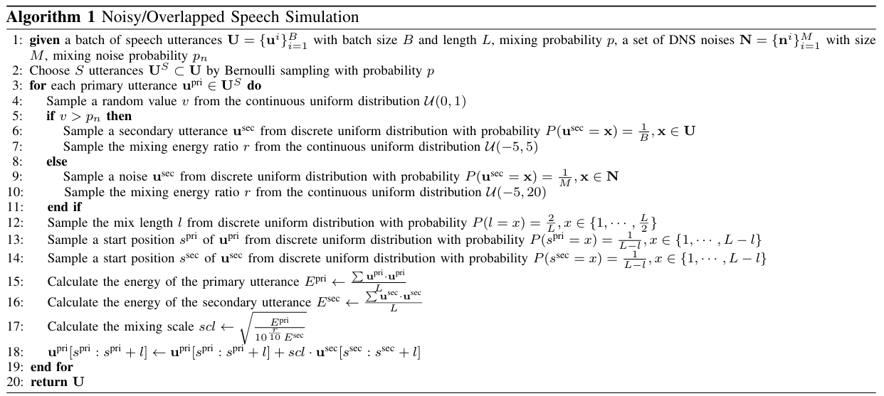 - Noisy/overlapped speech simulation은 아래 [Algorithm 1]을 따름