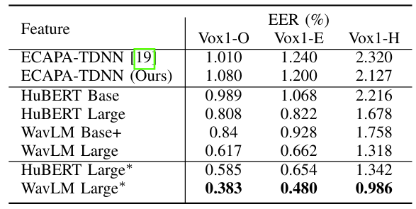 - Speaker verification task에 대해서도 WavLM이 효과적임