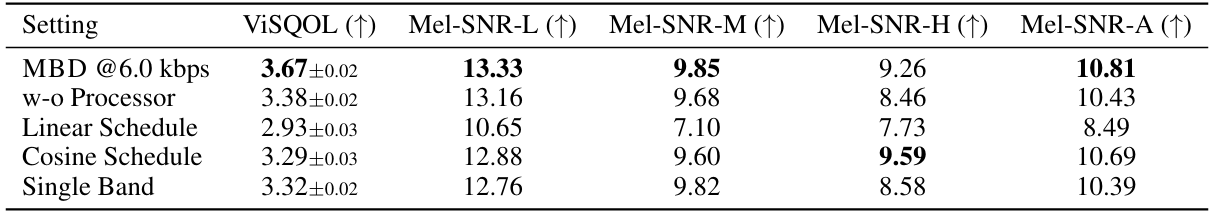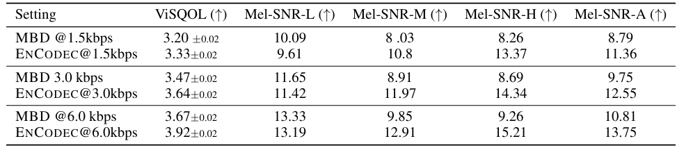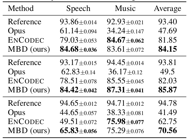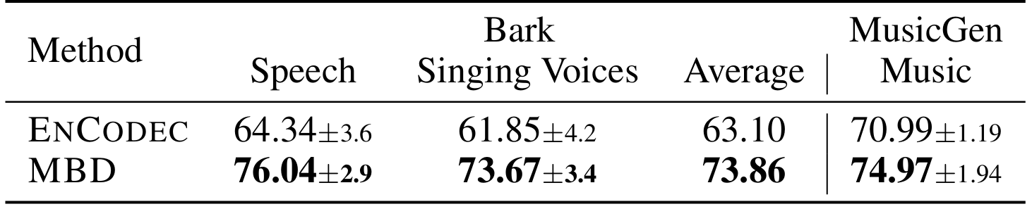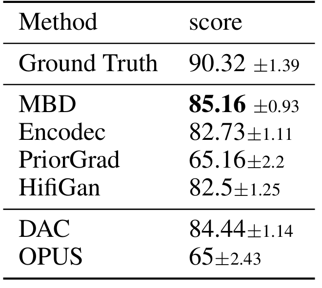 - MusicGen과 Bark에 각각 MBD를 적용했을 때, 기존보다 더 나은 MUSHRA score를 달성함