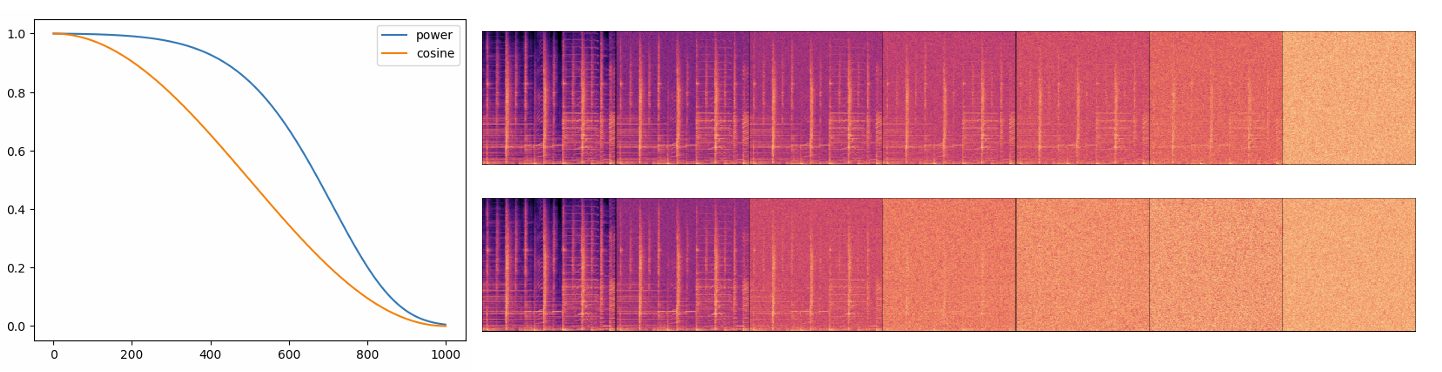 - Rich harmonic content를 가지는 audio data를 위해 Power Noise Scheduler를 설계