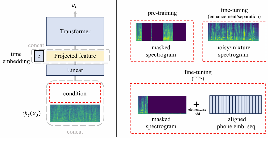 - Flow Matching과 masked condition을 사용하여 untranscribed speech로 pre-training을 수행