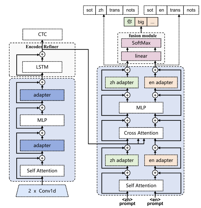- 서로 다른 language prompt를 통해 guide 되는 language-specific adapter를 사용하면, decoder는 attention-based decoding 중에 해당 language에 focus 할 수 있음 - 추가적으로 논문은 decoder end에 lightweight fusion module을 add 함