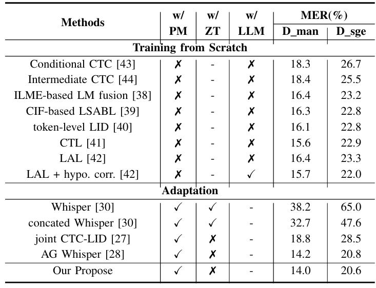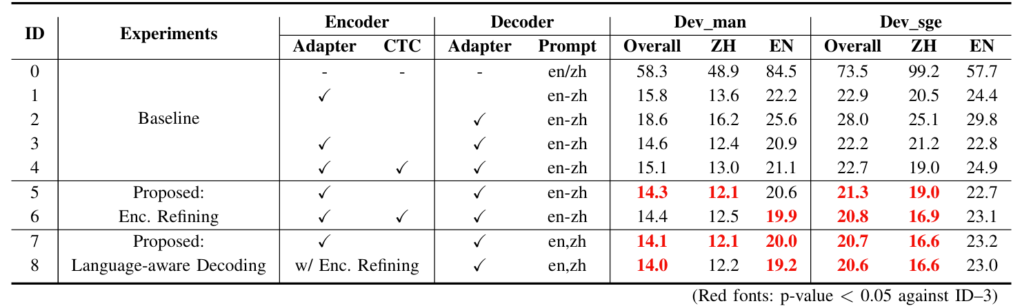 - Whisper를 기반으로 Encoding Refiner, Lagnuage-Aware Decoding을 적용한 CS-ASR model