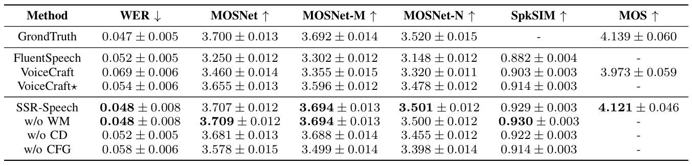 - Speech Editing 측면에서 SSR-Speech 성능이 가장 뛰어남