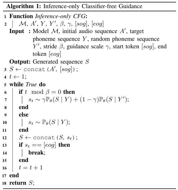 - $\gamma$ : guidance scale, $Y'$ : $Y$와 같은 length를 가지는 random phoneme sequence - 추가적으로 CFG는 silence token을 excessively remove 할 수 있으므로, 추론 시 $\beta$ stride로 CFG를 활용함