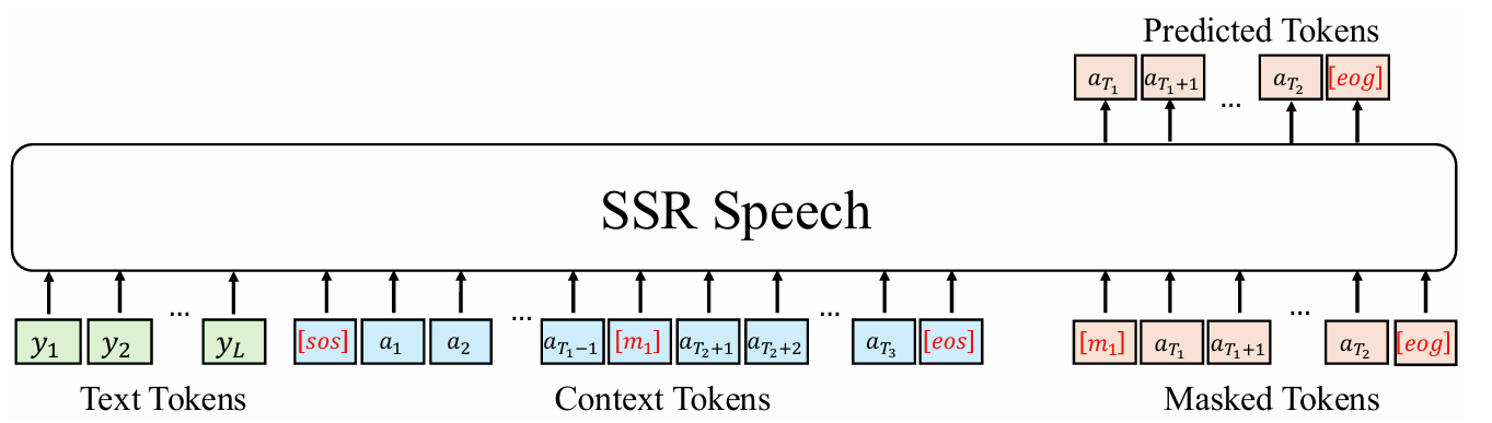 - SSR-Speech는 text token, audio neural codec token을 input으로 사용하고 language modeling manner로 masked audio token을 predict 하는 Transformer decoder를 활용함