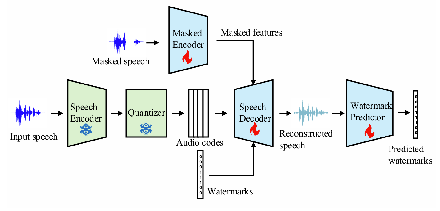 - 구조적으로는 speech encoder, quantizer, speech decoder, masked decoder, watermark predictor로 구성됨