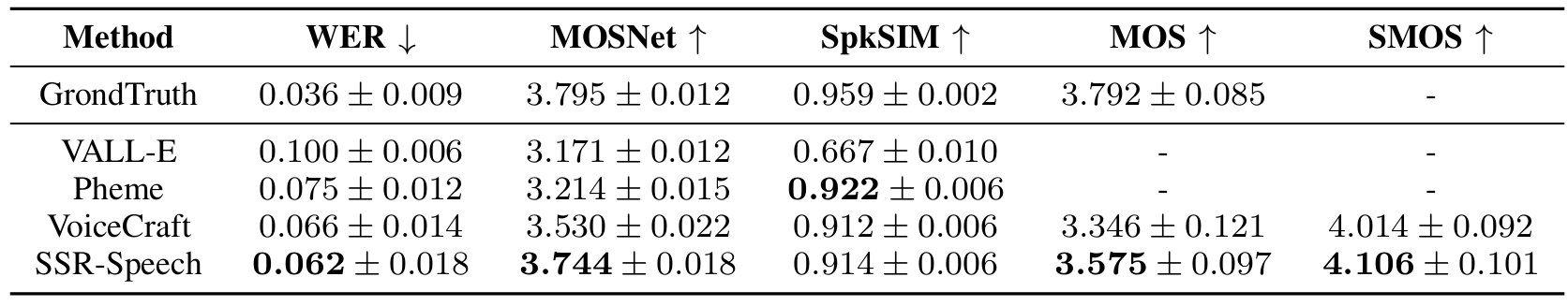 - TTS task에서도 SSR-Speech는 가장 우수한 성능을 보임