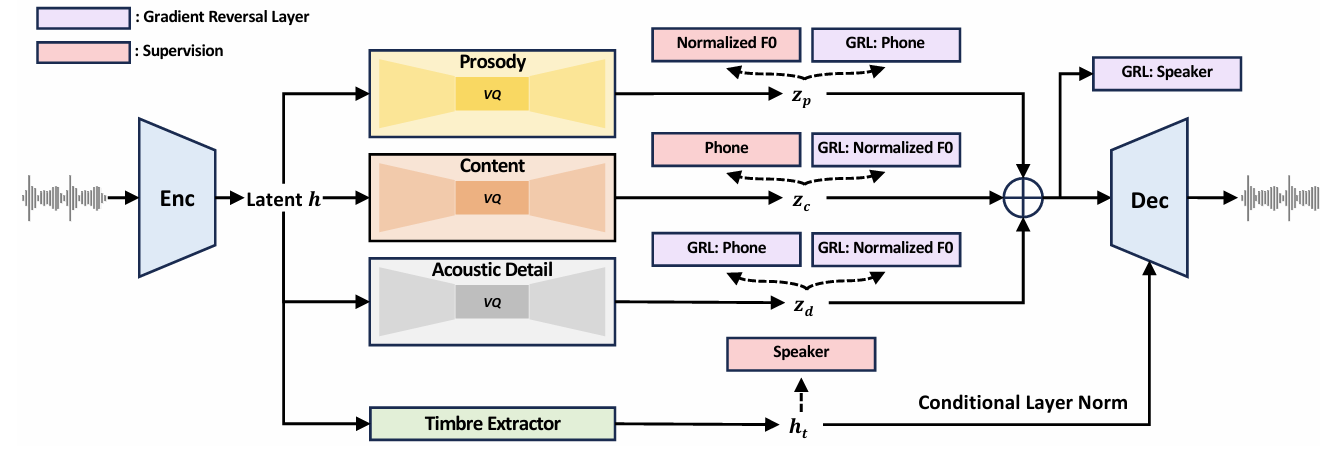 - 추가적으로 $z_{p},z_{c},z_{d}$의 summation에 speaker-GRL을 적용하여 timbre를 reduce 함