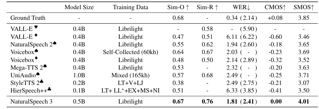 - Comparisons : VALL-E, NaturalSpeech2, VoiceBox, Mega-TTS2, UniAudio, StyleTTS2, HierSpeech++