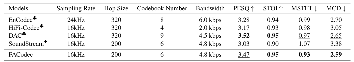 - FACodec은 STOI, MSTFT, MCD 측면에서 가장 뛰어난 성능을 보임