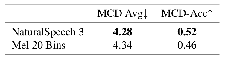- Handcrafted prosody feature (20-bin mel-spectrogram)과 비교하여 NaturalSpeech3의 prosody representation은 더 나은 prosody similarity를 달성함