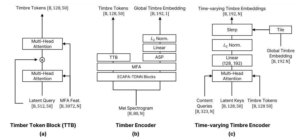 - Timbre token은 cross-attention mechanism을 통해 추출되고, trainable latent vector는 query로 사용되고, key/value는 timbre encoder에서 얻어짐