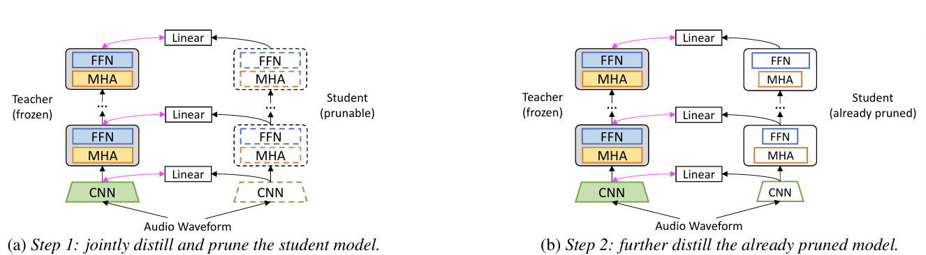 - Knowledge Distillation과 task-specific Structured Pruning을 통해 self-supervised model을 compress