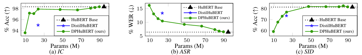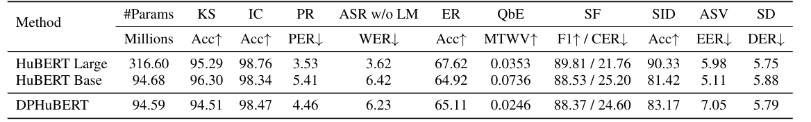 - DPHuBERT는 HuBERT-Large를 HuBERT-Base와 비슷한 size로 compress 할 수 있음