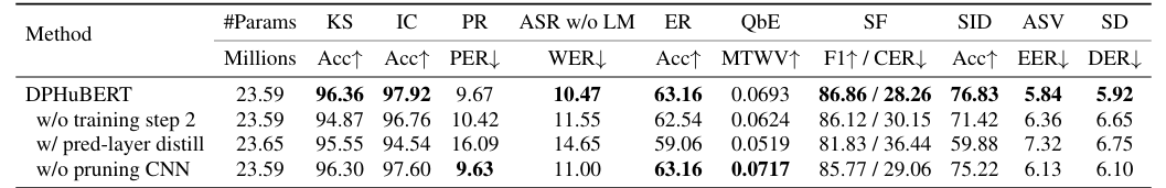 - 전체적으로 DPHuBERT의 성능이 가장 우수함