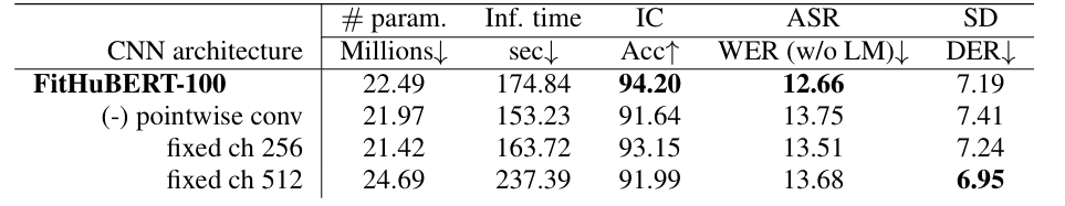 - 즉, model compression을 위해 lower layer channel은 reduce 될 수 있음 - 따라서 FitHuBERT에서 first CNN layer는 teacher에 비해 4배 reduce 됨