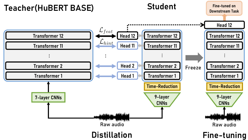 - Hint-based distillation, time-reduction layer를 활용한 thinner & deeper speech SSL model