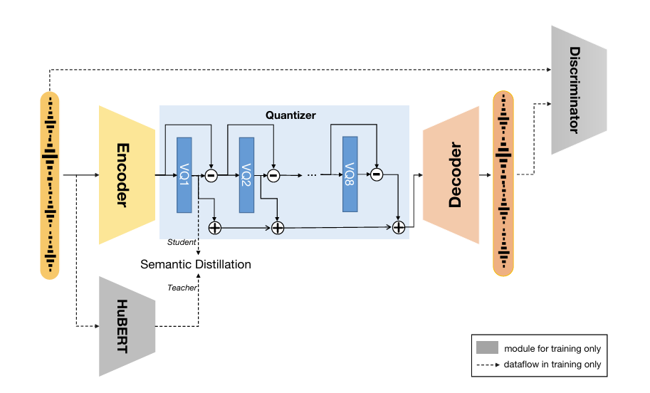 - Training 시 semantic teacher는 RVQ process를 guide 하기 위해 semantic representation을 제공함