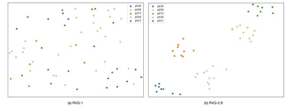 - $t$-SNE 측면에서 RVQ-1 representation은 randomly scatter 되는 반면, RVQ-2:8 representation은 cluster로 나타남