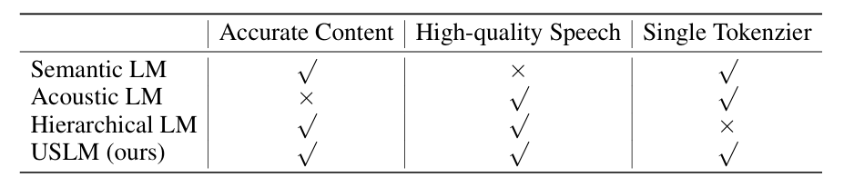 - 한편으로 speech LM은 아래 표와 같은 speech token modeling을 채택할 수 있음