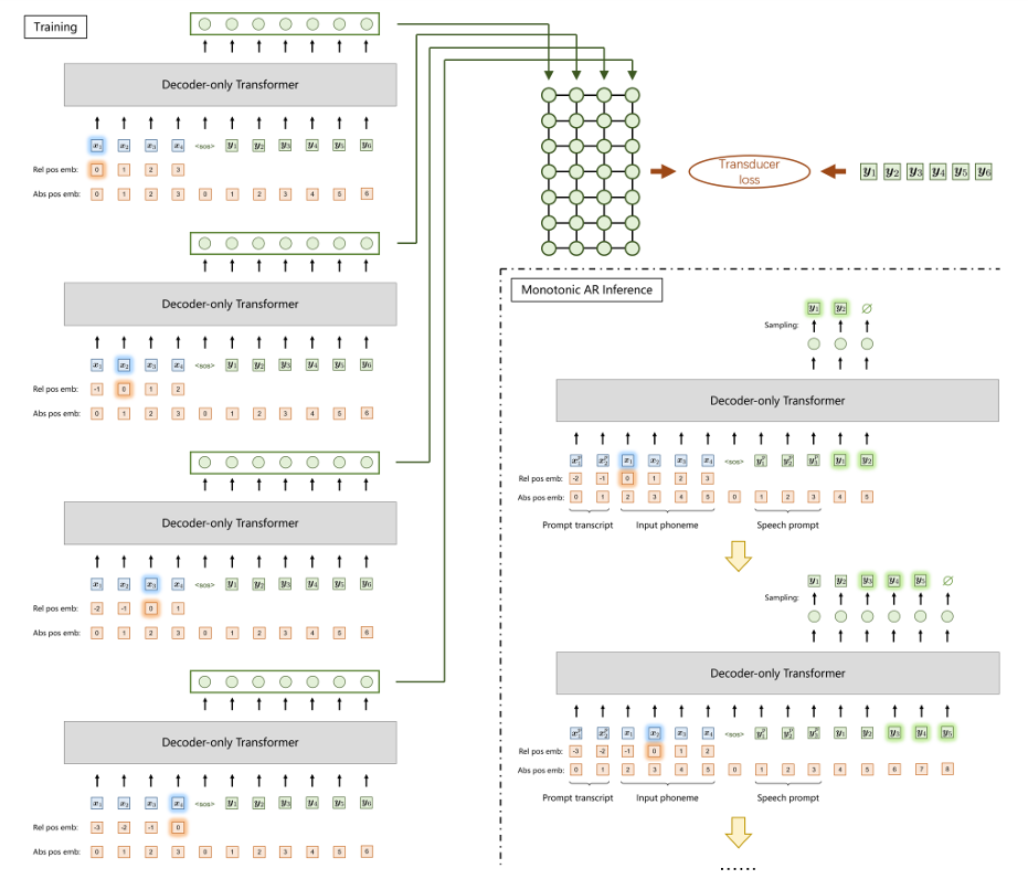 - 결과적으로 absolute, relative position embedding은 input phoneme embedding에 add 된 다음, decoder-only Transformer에 전달됨