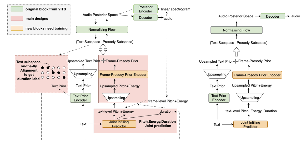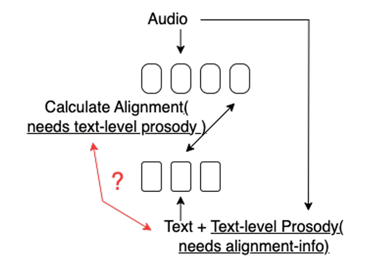- BUT, 아래 그림과 같이 alignment calculation 이전에 text-level에서 prosody sequence를 얻을 수 없으므로 on-the-fly alignment search가 어려움