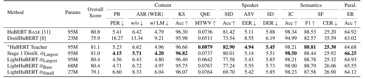 - ASR task 측면에서 LightHuBERT가 가장 우수한 성능을 달성함