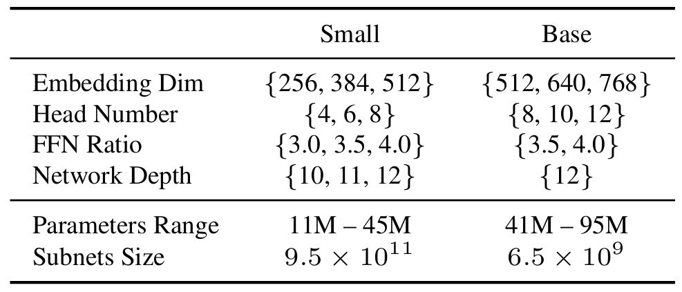 - Attention dimension (key, query, value matrix)는 $64\times$ head 수로 constrain 함 - Small, large network 간의 interference는 large network의 성능을 저해하므로 논문은 아래 표와 같이 서로 다른 size를 가지는 2개의 supernet을 고려함