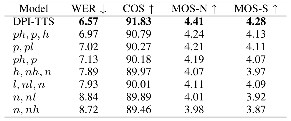 - 합성 품질 측면에서도 DPI-TTS는 가장 우수한 성능을 보임