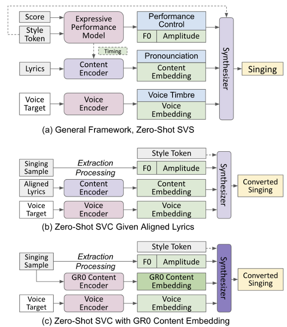 - Linguistic content, performance attribute, singing style 등의 fine-grained disentanglement를 기반으로 한 zero-shot cross-domain SVS, SVC model