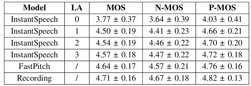 - 전체적으로 InstantSpeech는 Look Ahead (LA)가 늘어날수록 MOS가 향상됨