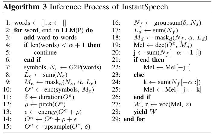 - [Algorithm 3]는 LLM의 text stream에 따라 waveform chunk $W$를 생성하는 inference process에 해당함