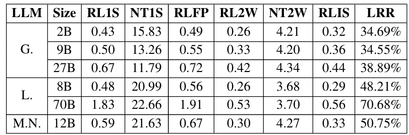 - Gemma2 (G), Llama3.1 (L), Mistral NeMo (M.N.)의 3가지 LLM에 대해,