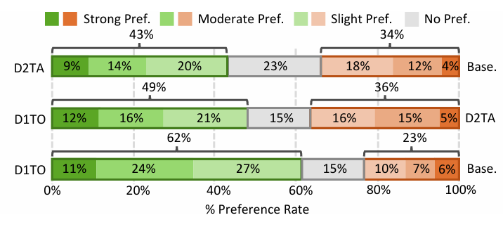 - Preference 측면에서도 D2TA, D1TO 모두 baseline 보다 더 선호됨