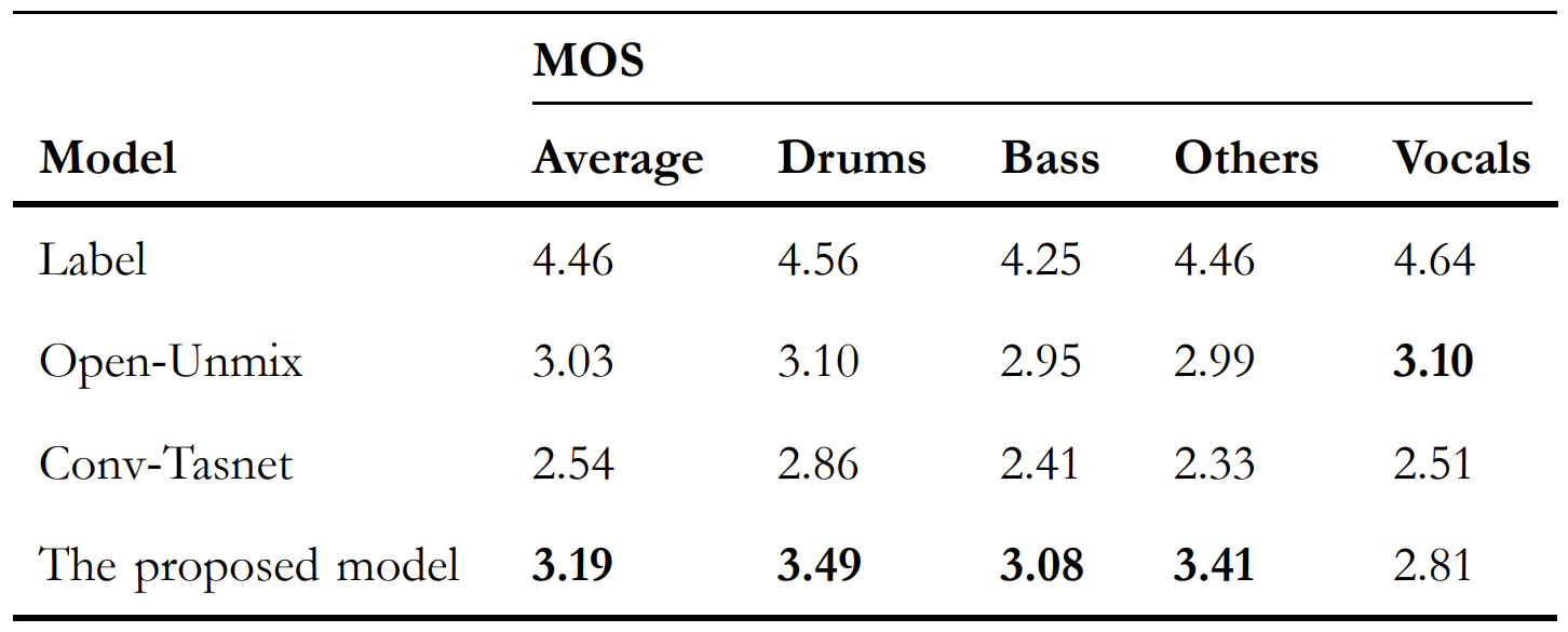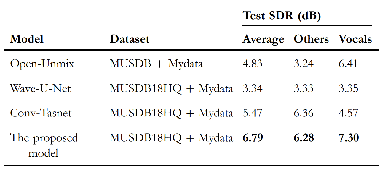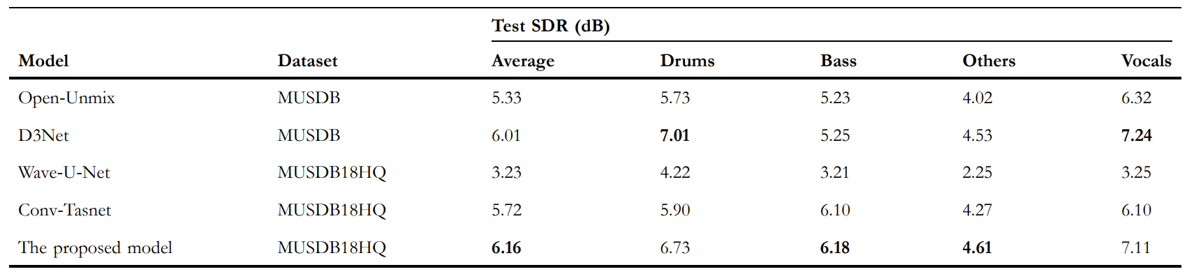 - Comparisons : Open-Unmix, D3Net, Wave-U-Net, Conv-Tasnet